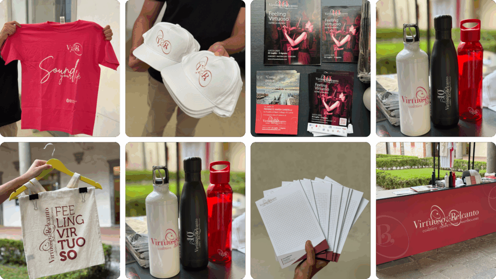 - Merchandising e materiali fisici: cappellini, t-shirt, ventagli, lapis, brochure, dépliant, cartellonistica, bandiere e roll-up, tutti coerenti e coordinati con la nuova immagine del Festival.